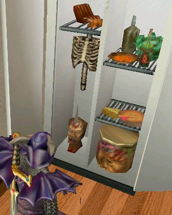 Auric's Ultima Moongates has an Ultima IX Easter Eggs page, here's a screenshot I took of the Avatar's fridge full of dead parts, it's