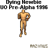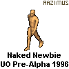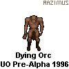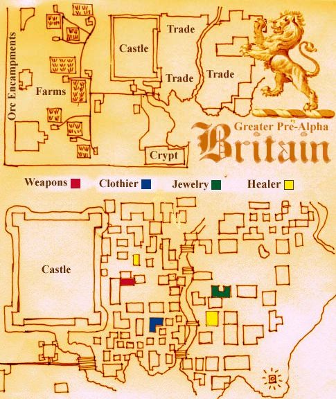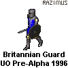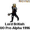 The second map is from the 1996 owo.com website, the original was cut into 2 jpgs. This was the map OSI provided for the pre-alpha testers. As you can see the pre-alpha was a very small portion of the map used today. The map used today was created from scratch, but this pre-alpha map was used as a guide. This explains the differences and similarities found on this map. The map consisted of the city of Britain, farms, orc camps & crypts. Not listed it also included the tower of the evil npc mage Myndon, and the godlands which were outside of the boundary. I will add a very detailed pre-alpha page with screenshots in the future. The third map is from the 1997 owo.com website, it is the original drawing made of the map that would be turned into the cloth map. Lord British : ![]() This is Lord British as he was in the 1996 Pre-Alpha Test. His character was made to always hold a maul, it must be his favorite weapon. His character also has a ponytail just like he does in real life. His character has a transparent hole, that's how it was made, up close you can see the cobblestone ground through LB. (Cropped screenshots of LB are from Auric's Ultima Moongates and Newton Dragon. The transparent clear images of LB are thanks to InsideUO by Alazane (a cool program you can use to view UO art) The link is broken I will look for a new one.